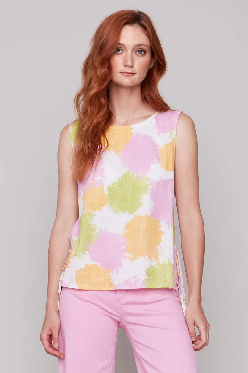 Express your creativity this spring and summer with this sleeveless top showcasing a vibrant splatter print inspired by abstract art. Designed for fashion lovers who value freedom, it features adjustable side ties for a customizable fit. Made from a breathable linen-blend fabric, this top effortlessly blends comfort and style for warm-weather days.