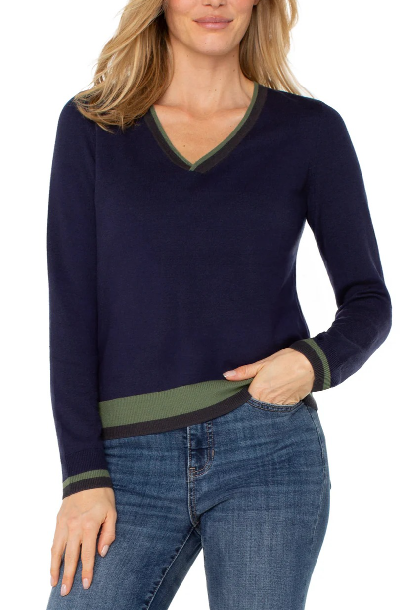 This classic V-neck sweater combines timeless style with a sporty edge. Crafted from a soft knit fabric, it features contrast ribbed trim at the neckline, cuffs, and hem in olive and dark brown tones. Perfect for casual days or layering up in style, this versatile piece pairs effortlessly with jeans, trousers, or skirts.