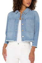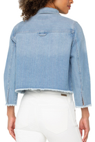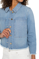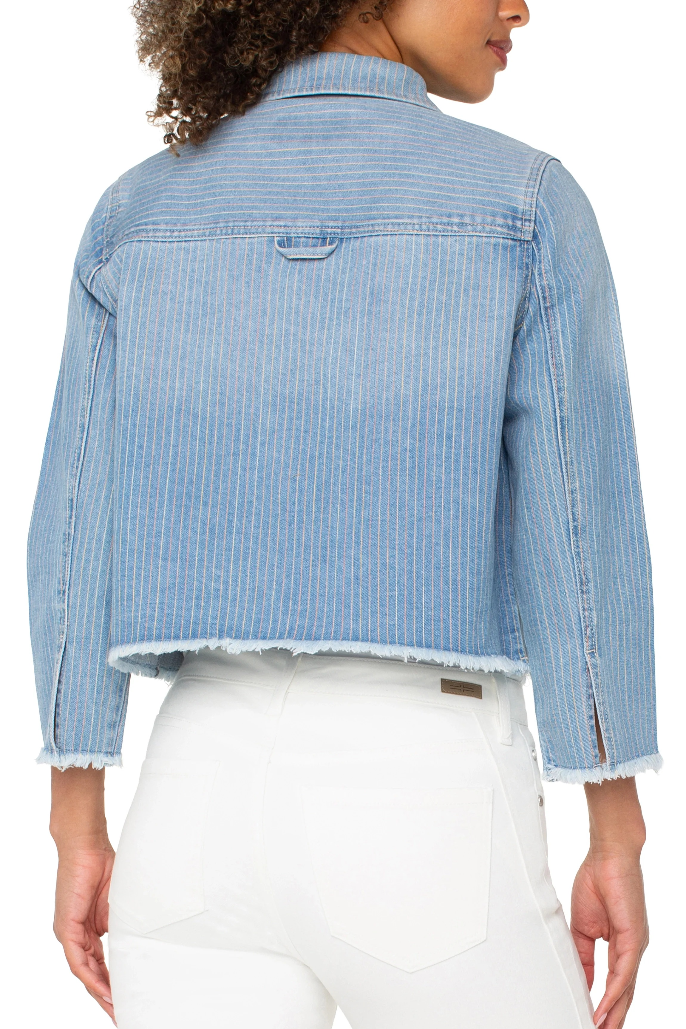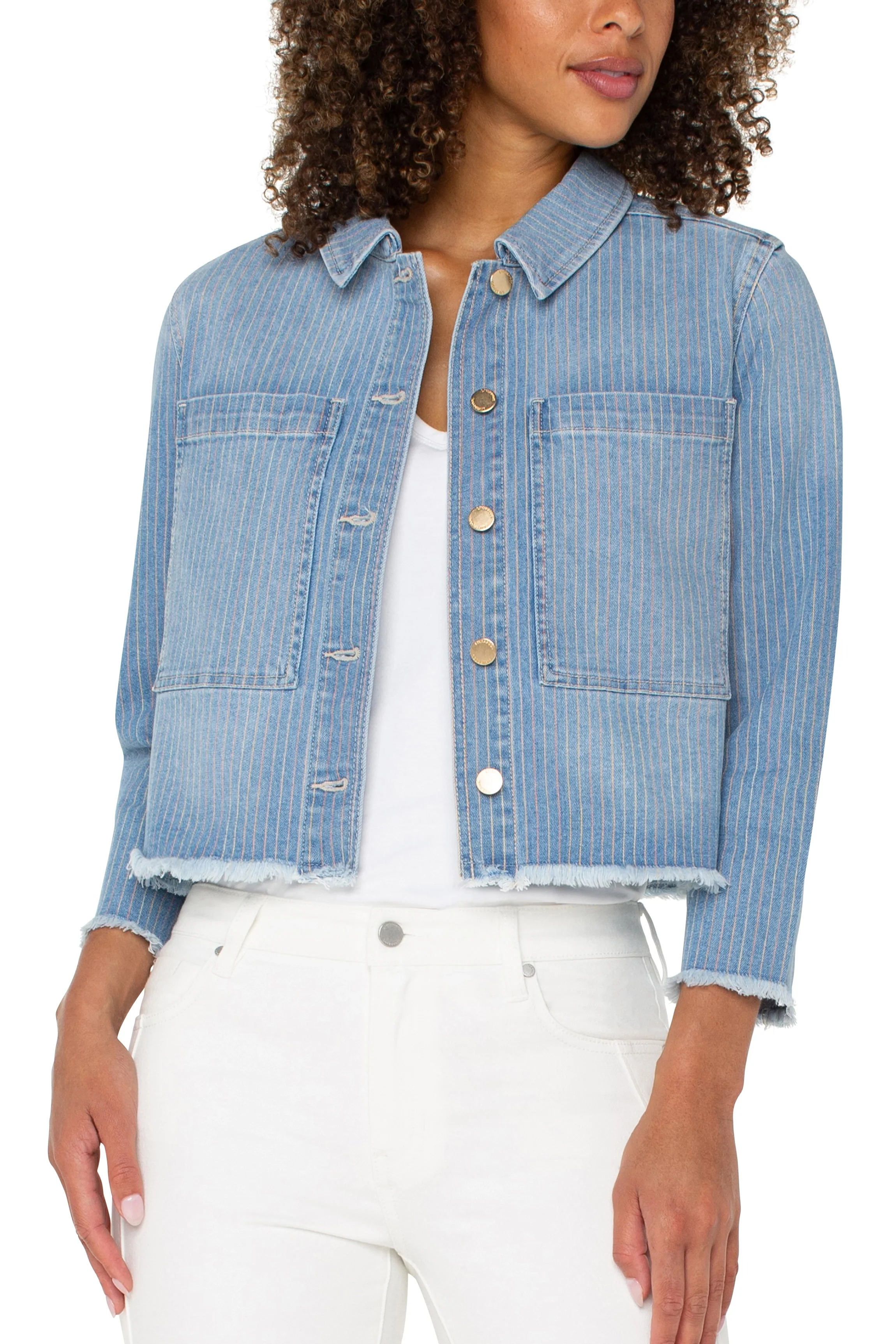 This stylish cropped shacket puts a modern spin on a timeless favorite with its subtle stripes and light wash finish. The striped design and frayed hem add a laid-back yet polished touch, making it a versatile piece that transitions effortlessly from casual to elevated looks.