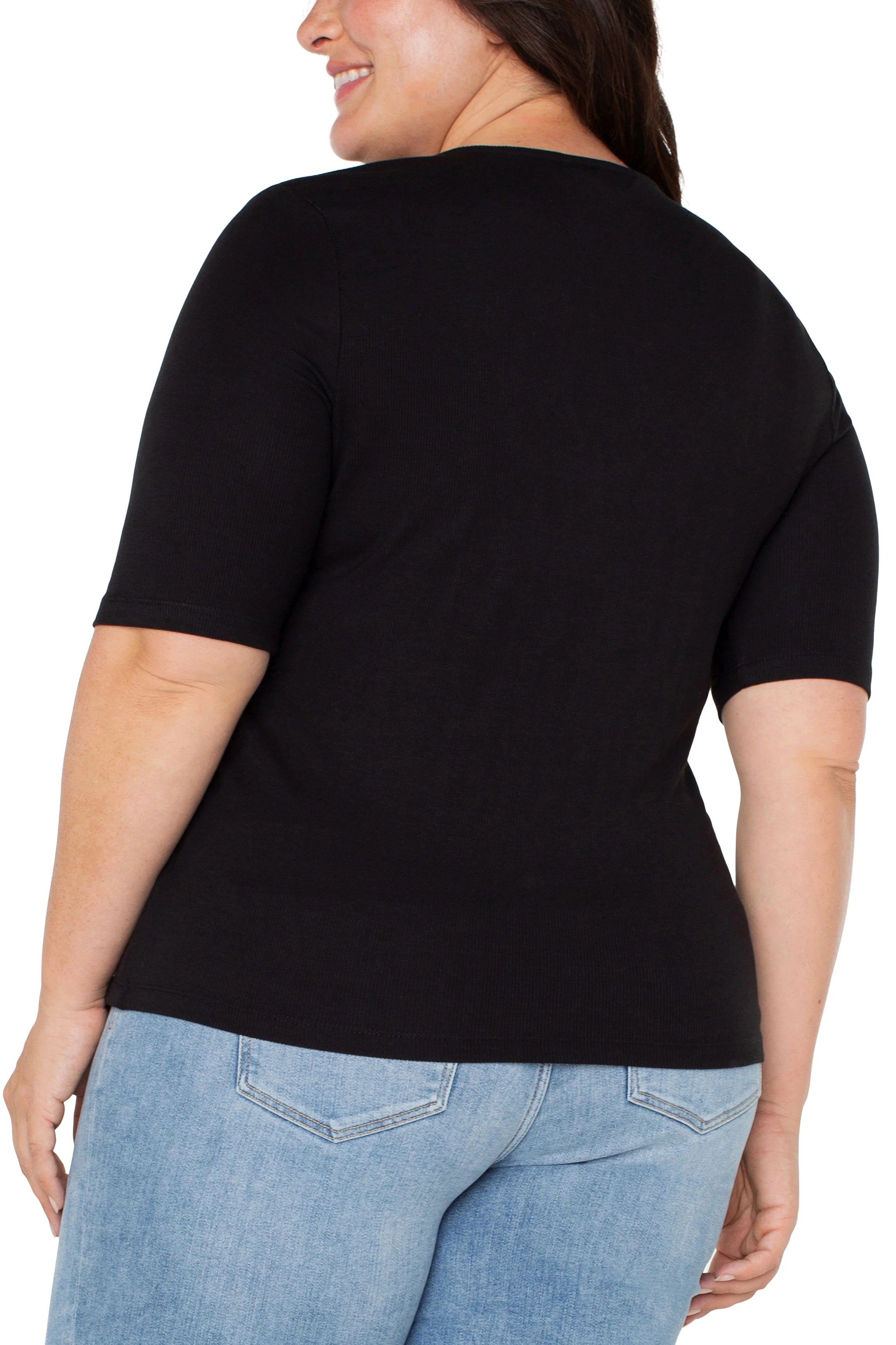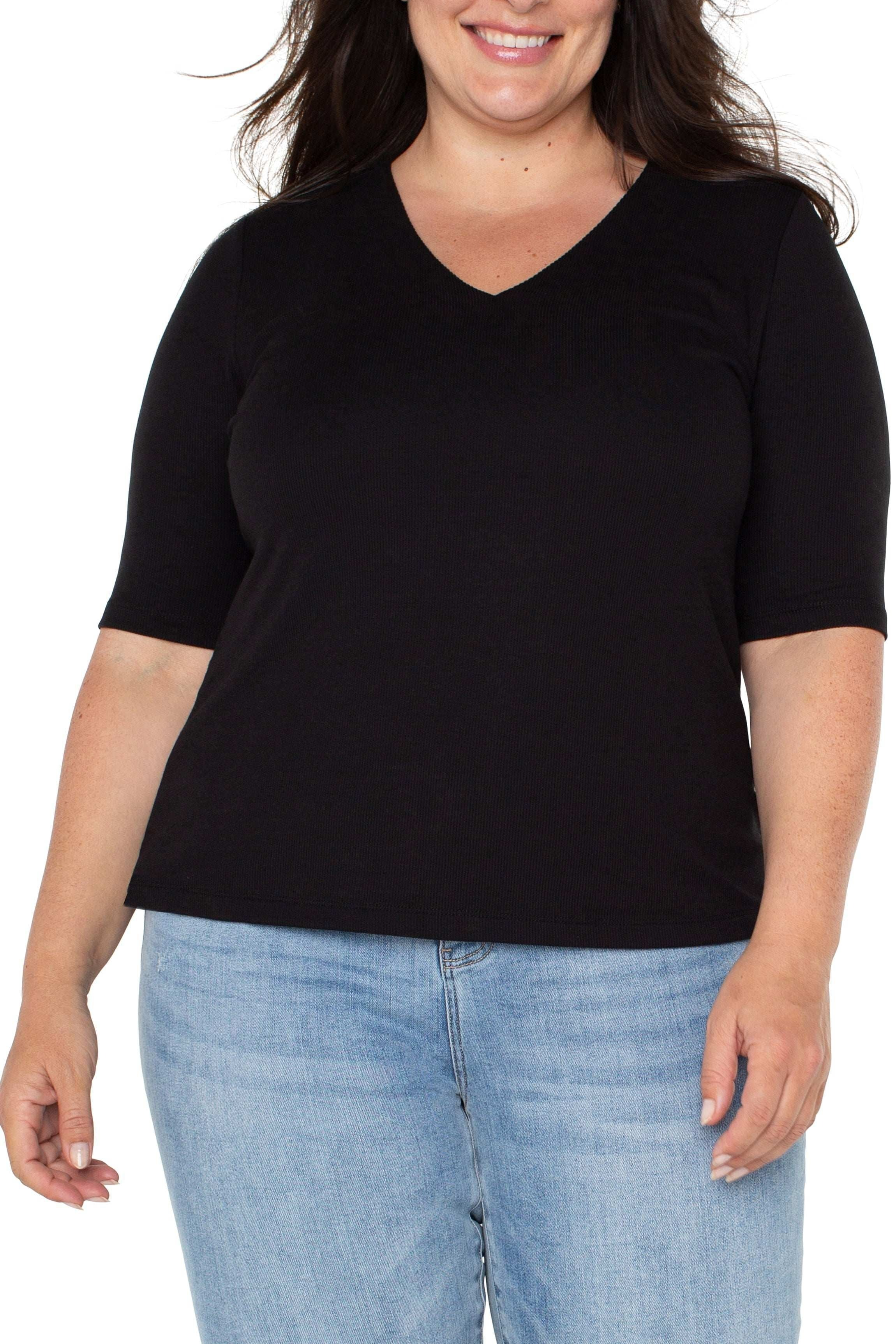 This updated V-neck is crafted from a soft mini rib knit, offering a sleek and flattering fit. Designed with a double-layered front for smooth, confident coverage and finished with elbow-length sleeves for added sophistication, it’s a versatile staple that transitions seamlessly from polished days to effortless evenings.