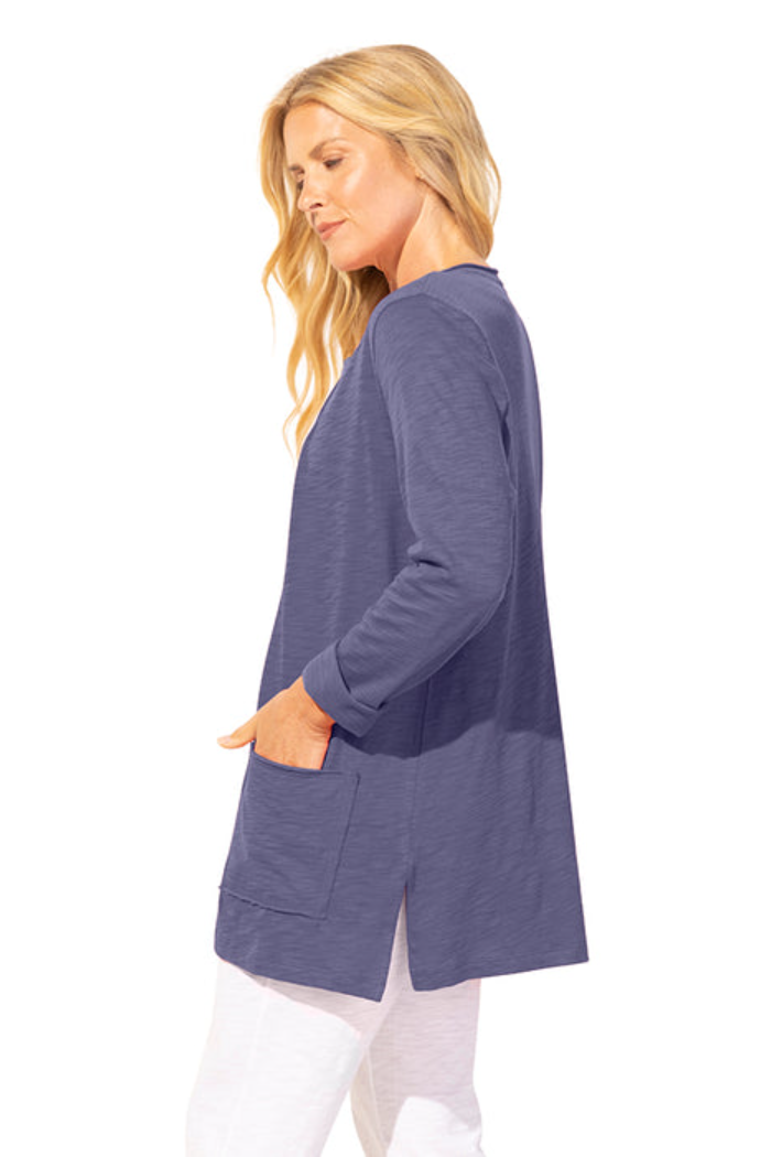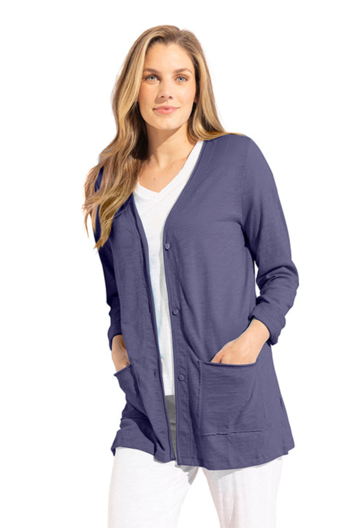 This roll-front button-down cardigan is a perfect blend of style and comfort. Designed with a classic V-neckline and functional front pockets, it offers both a timeless look and everyday practicality. Crafted from 100% cotton, this lightweight yet cozy cardigan is ideal for layering in any season. Whether dressed up or down, it's a versatile staple for any wardrobe.