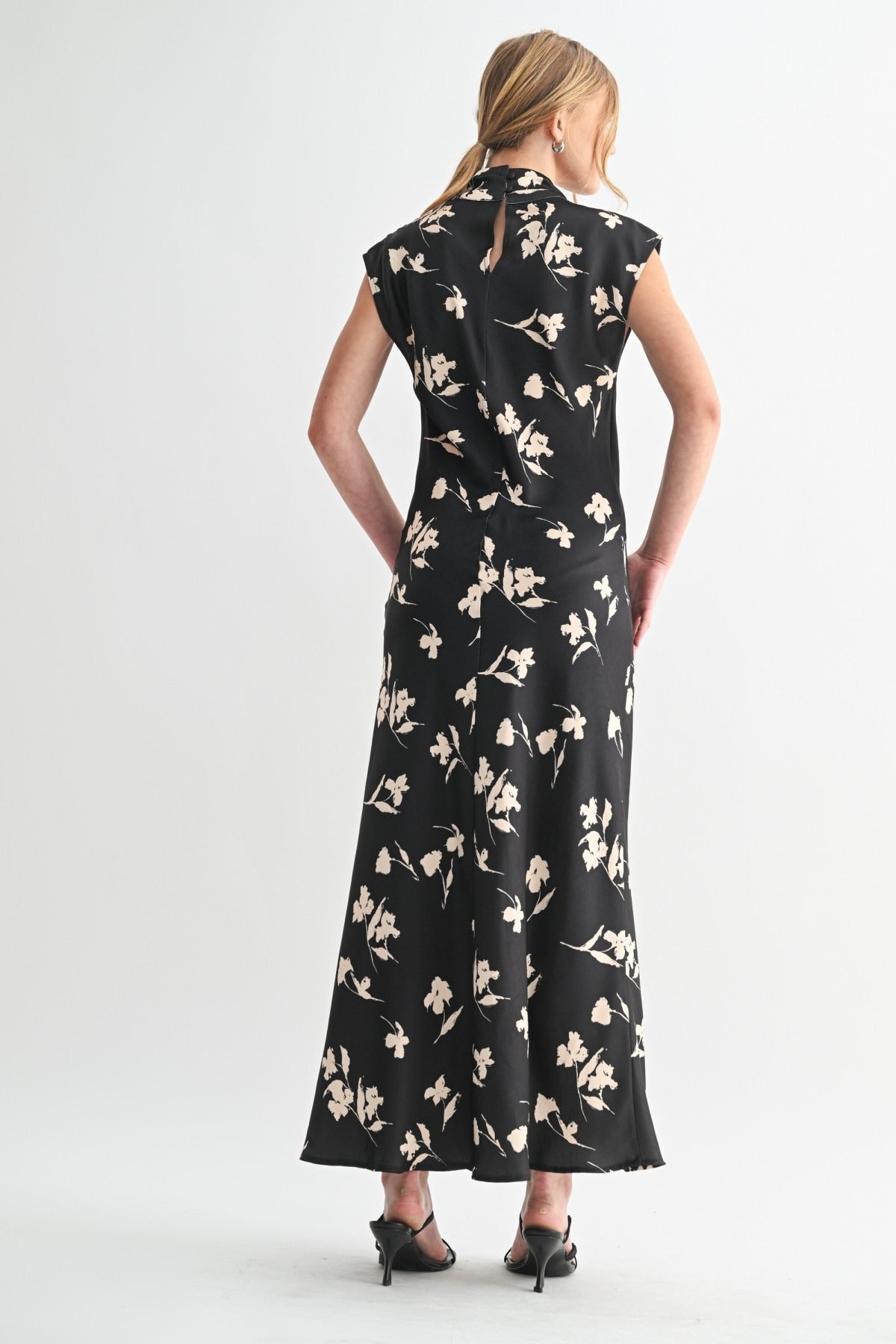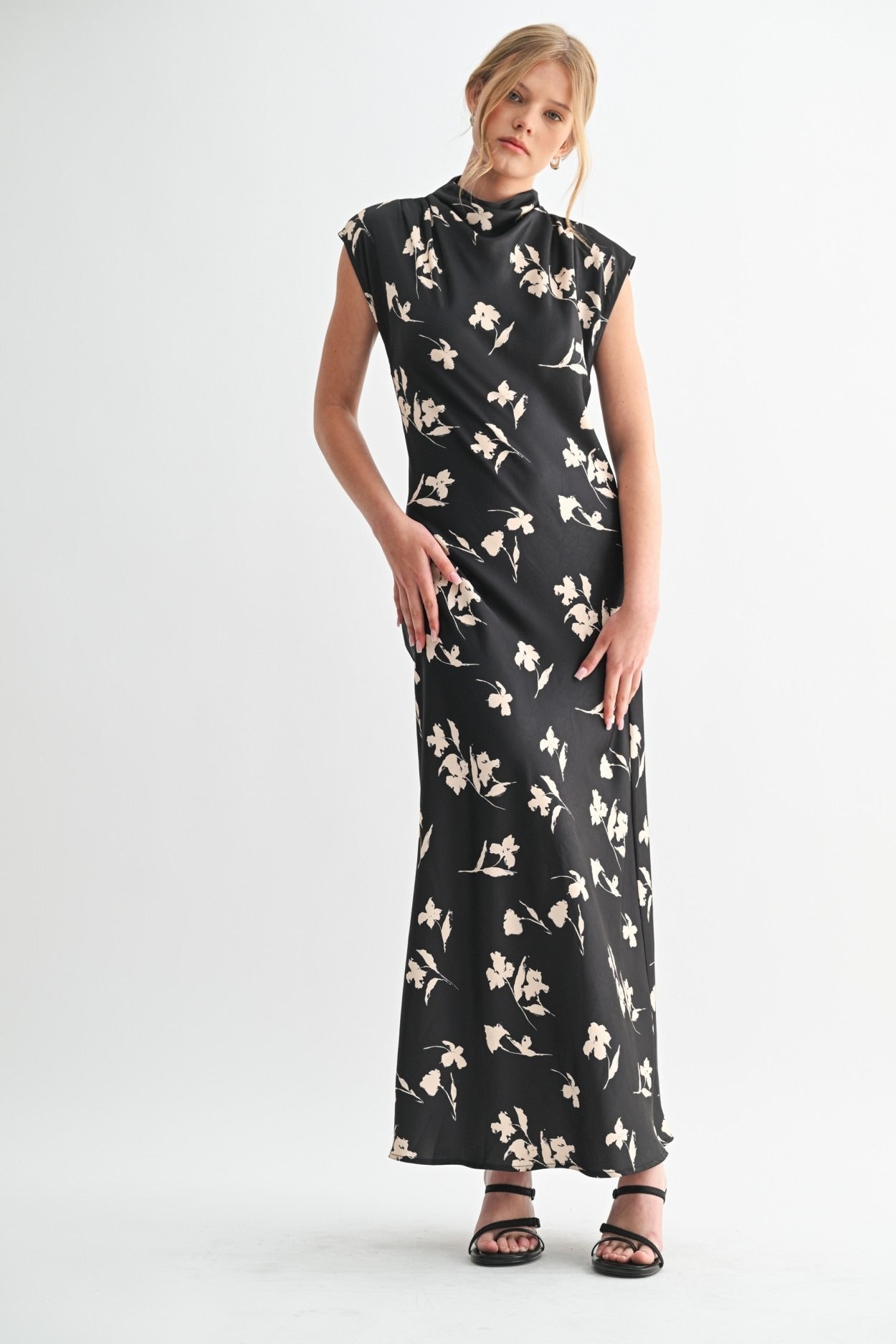 Effortlessly elegant, this Flower Print Satin Mock-neck Maxi Dress is designed to make a refined statement. Crafted from sleek satin, it drapes beautifully with a soft sheen that catches the light. The mock neckline and cap sleeves lend a touch of modern sophistication, while the allover floral print adds a romantic, feminine charm. Cut in a flowing maxi length, it elongates the silhouette for a graceful finish.