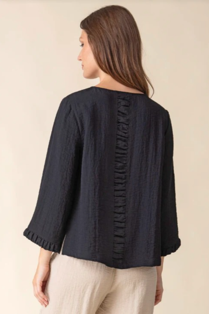 Refresh your wardrobe with this sophisticated black blouse, designed with delicate ruffle accents along the front and sleeves for a touch of elegance. Crafted from soft, textured fabric, it offers a relaxed yet refined silhouette that effortlessly balances comfort and style. The classic round neckline and three-quarter sleeves make it a versatile choice for any occasion, whether you're dressing up with tailored pants or keeping it casual with jeans. A timeless staple, this blouse is sure to become a go-to favorite.