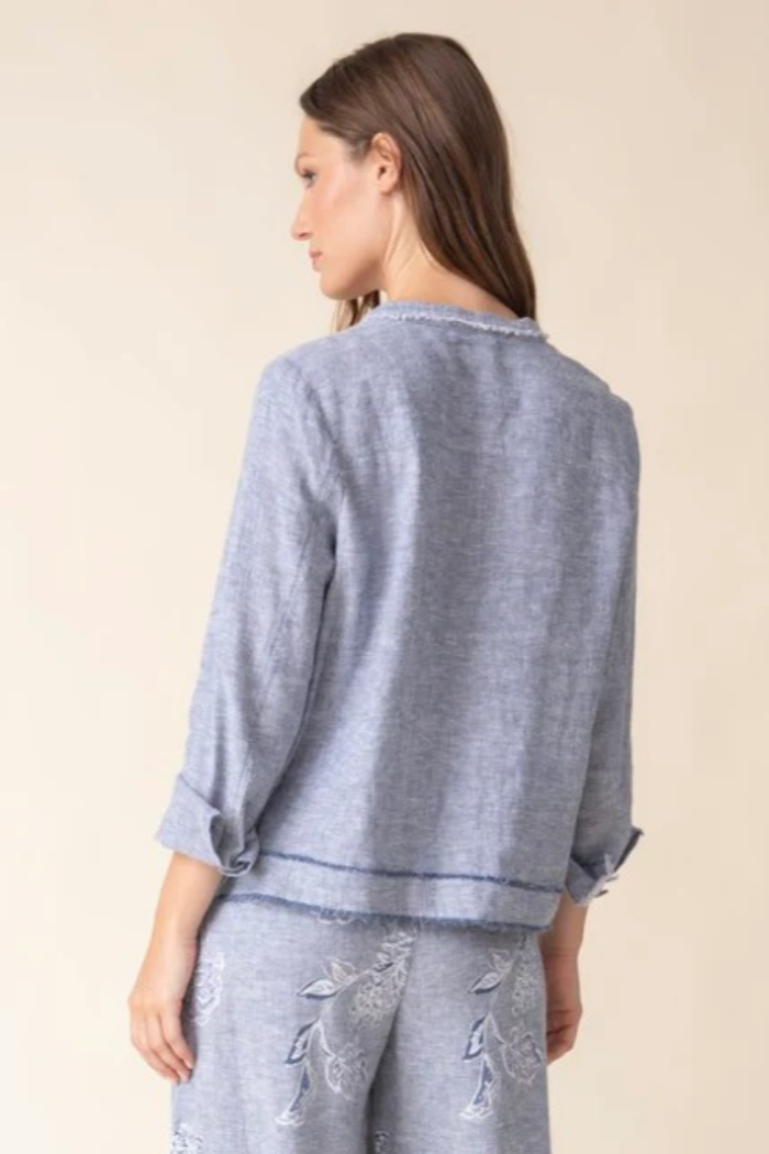 Cross-dyed linen-cotton yarns create a subtle two-tone effect, enhanced by textured fringe detailing. The patch pocket, sleeve cuffs, center front, and collar are all accented with fringe for added charm. It’s classic Habitat—effortless, elevated, and instantly recognizable. When you know, you know.