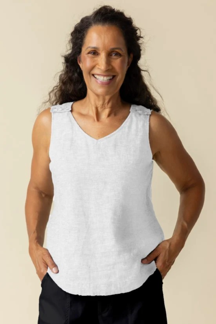 Refresh your tank collection with our soft linen-cotton V-neck tank, featuring shoulder button details, a rounded high-low hem, and angled seams that create a flattering, shaped silhouette.