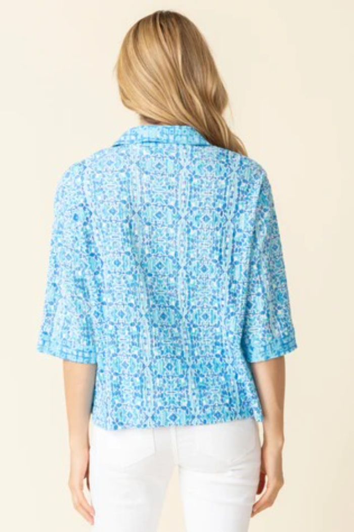 Stay stylish with on-trend contrast collars and cuffs, complemented by chic side slits and exclusive mixed prints. Made from travel-ready crinkle cotton with a hint of spandex, this piece offers all-day comfort and excellent fabric recovery—no ironing required!