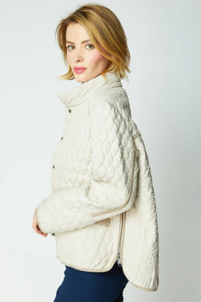 Effortlessly edgy, this piece features a snap-front design, a longer rounded back hem for added coverage, and dramatic side zippers that bring a bold, modern twist.