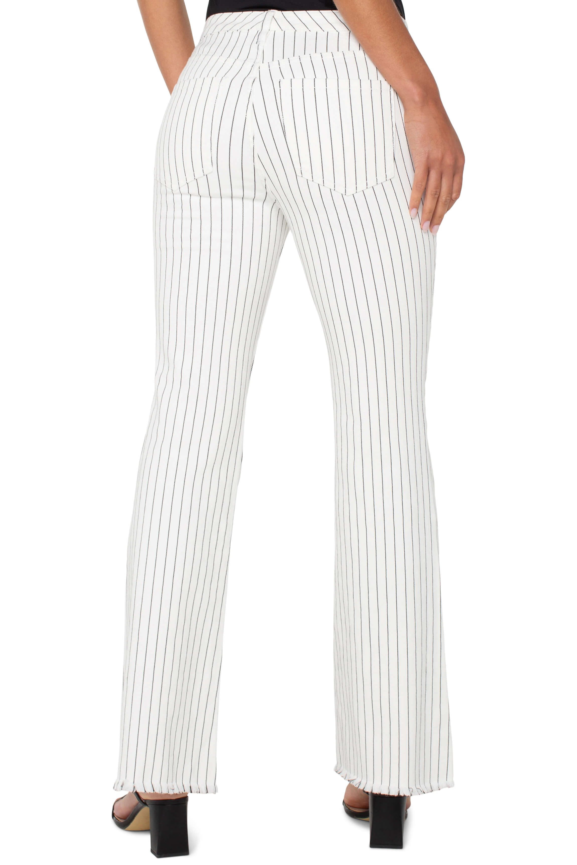 These flare jeans put a stylish spin on a timeless silhouette, showcasing a frayed hem and a pinstripe pattern that blends sophistication with a contemporary twist. The mix of sleek stripes and distressed accents adds a fresh, fashion-forward flair to your wardrobe.