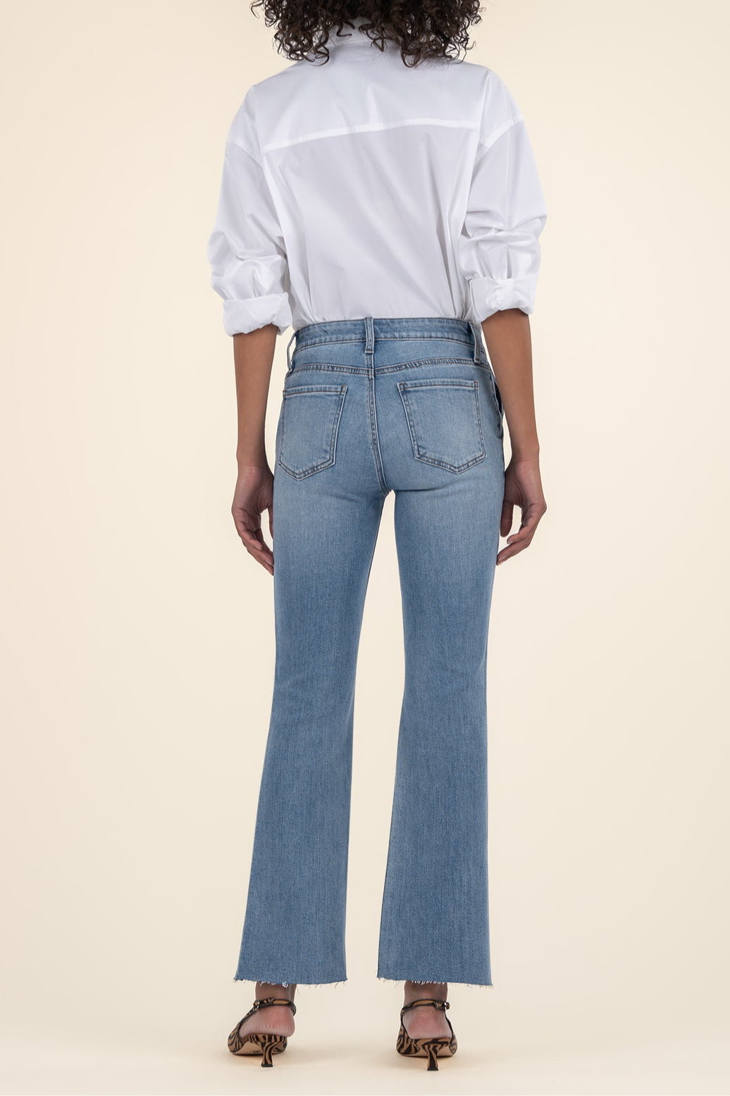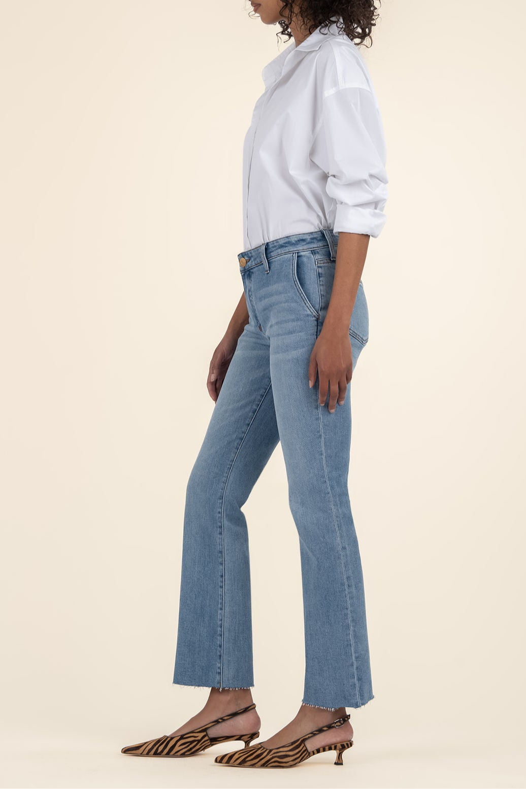 These mid-rise pants showcase a chic ankle flare silhouette and a raw hem, giving them a trendy, laid-back edge. Ideal for effortlessly elevating your everyday style with a modern touch.