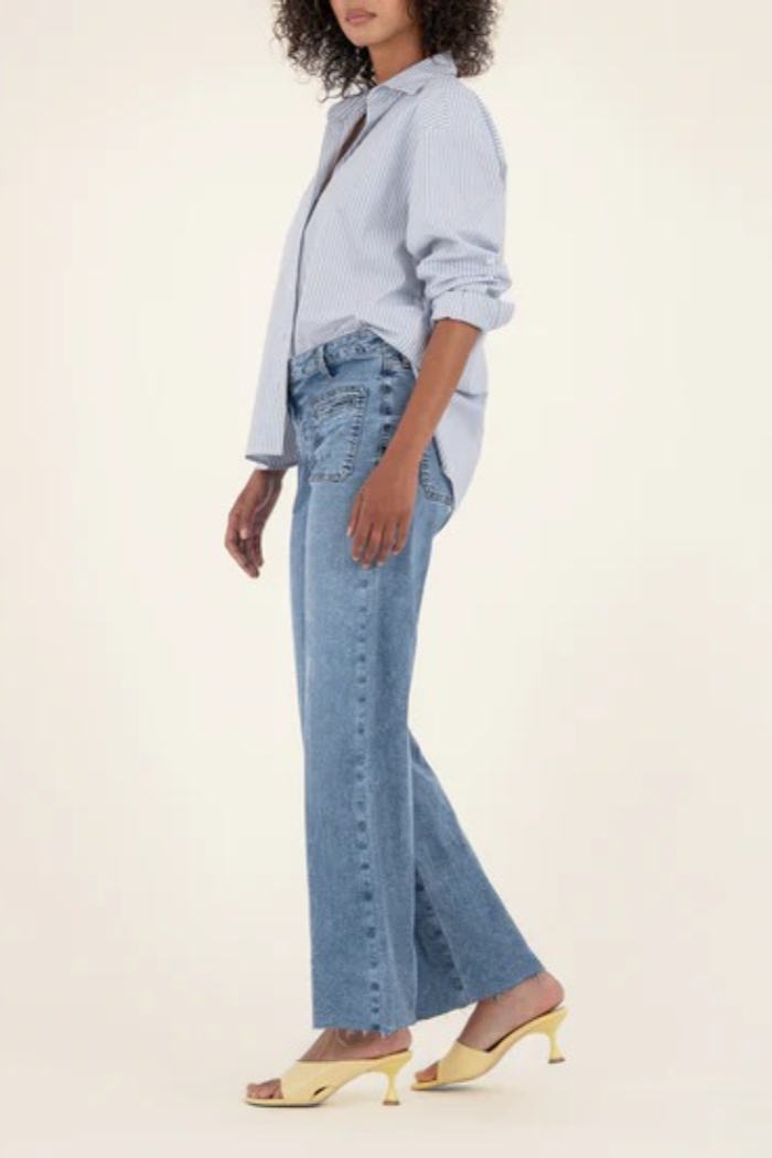 Keep your look current with these high-rise wide-leg jeans in a classic medium wash. Designed with chic front patch pockets and a raw hem for a modern edge, they’re easy to dress up or down—making them an essential piece for effortless, everyday style.