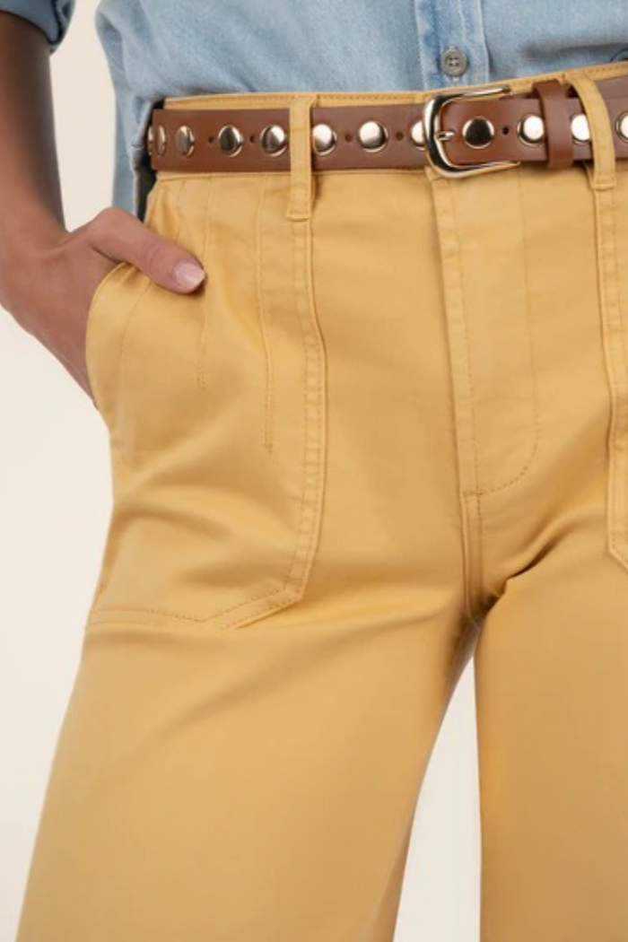 Add a pop of color to your wardrobe with these high-rise pants in a bold Dandelion shade. The wide-leg silhouette drapes effortlessly, while distinctive pork chop pockets bring a blend of practicality and style.
