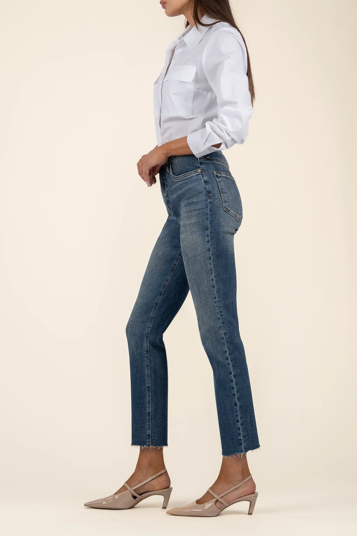 These high-rise jeans are designed with a raw hem and our signature Fab Ab pockets to ensure a flattering fit. The dark wash offers a versatile, everyday style that's comfortable and effortlessly adaptable for both casual and dressed-up occasions.