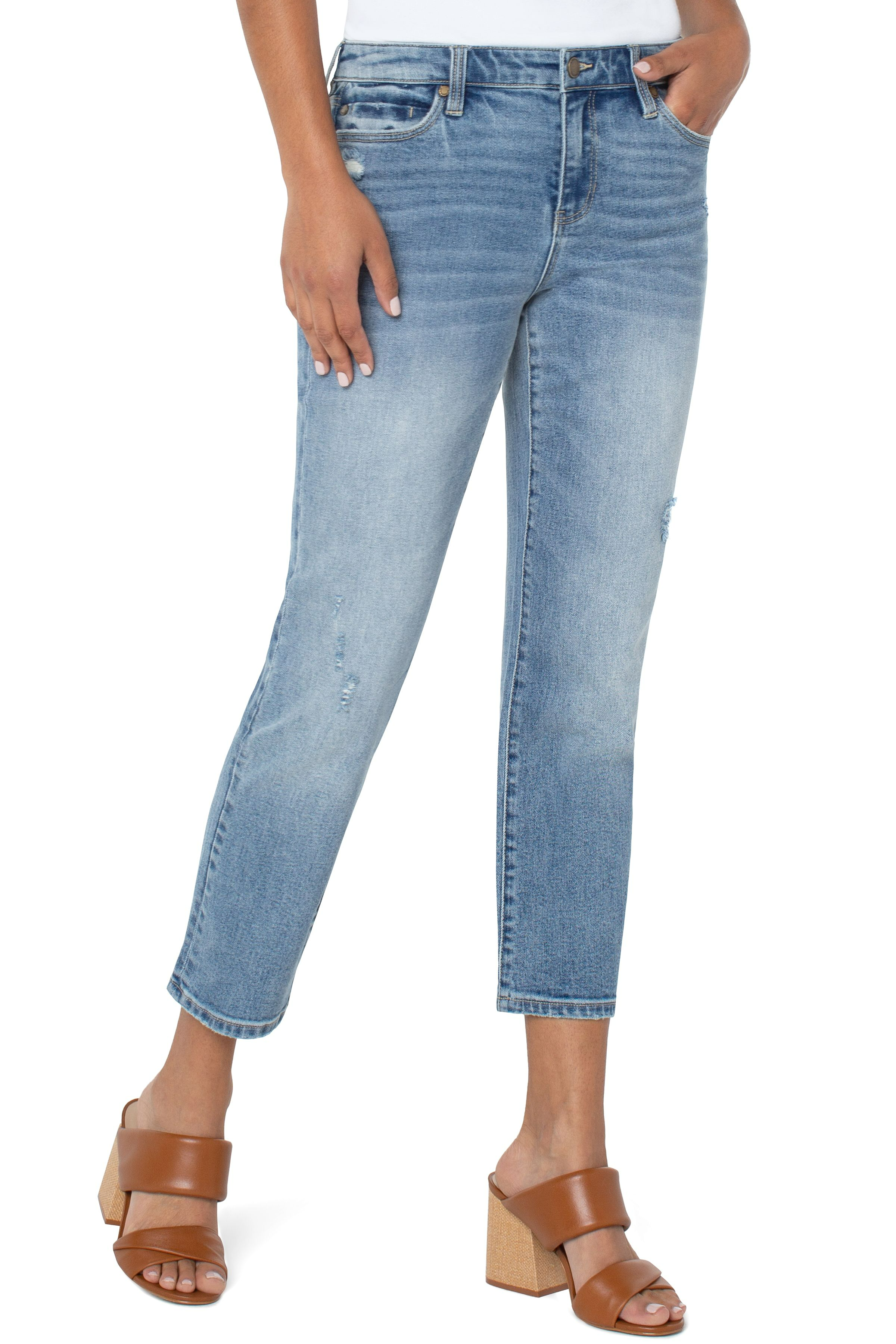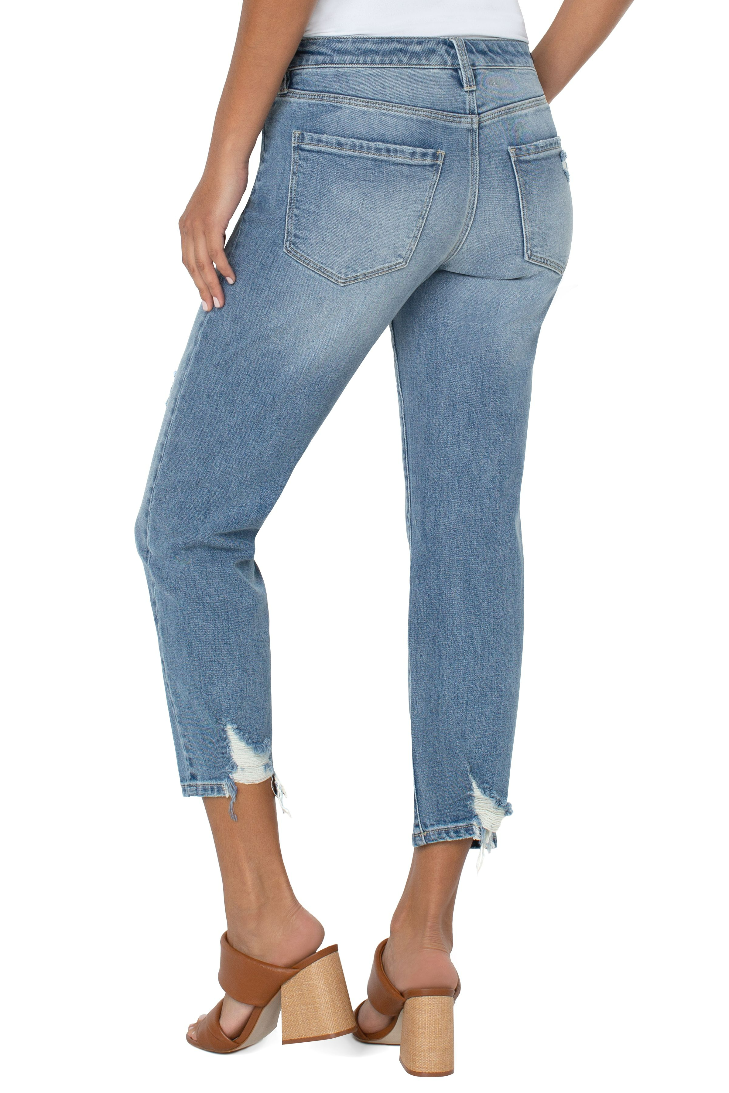 Mid-rise crop straight with destruction detail at the back hem. Update your wardrobe with a ready-to-wear trend everyone can pull-off. Dress it up with a chic blazer and heels or down with a classic tee and sneakers.
