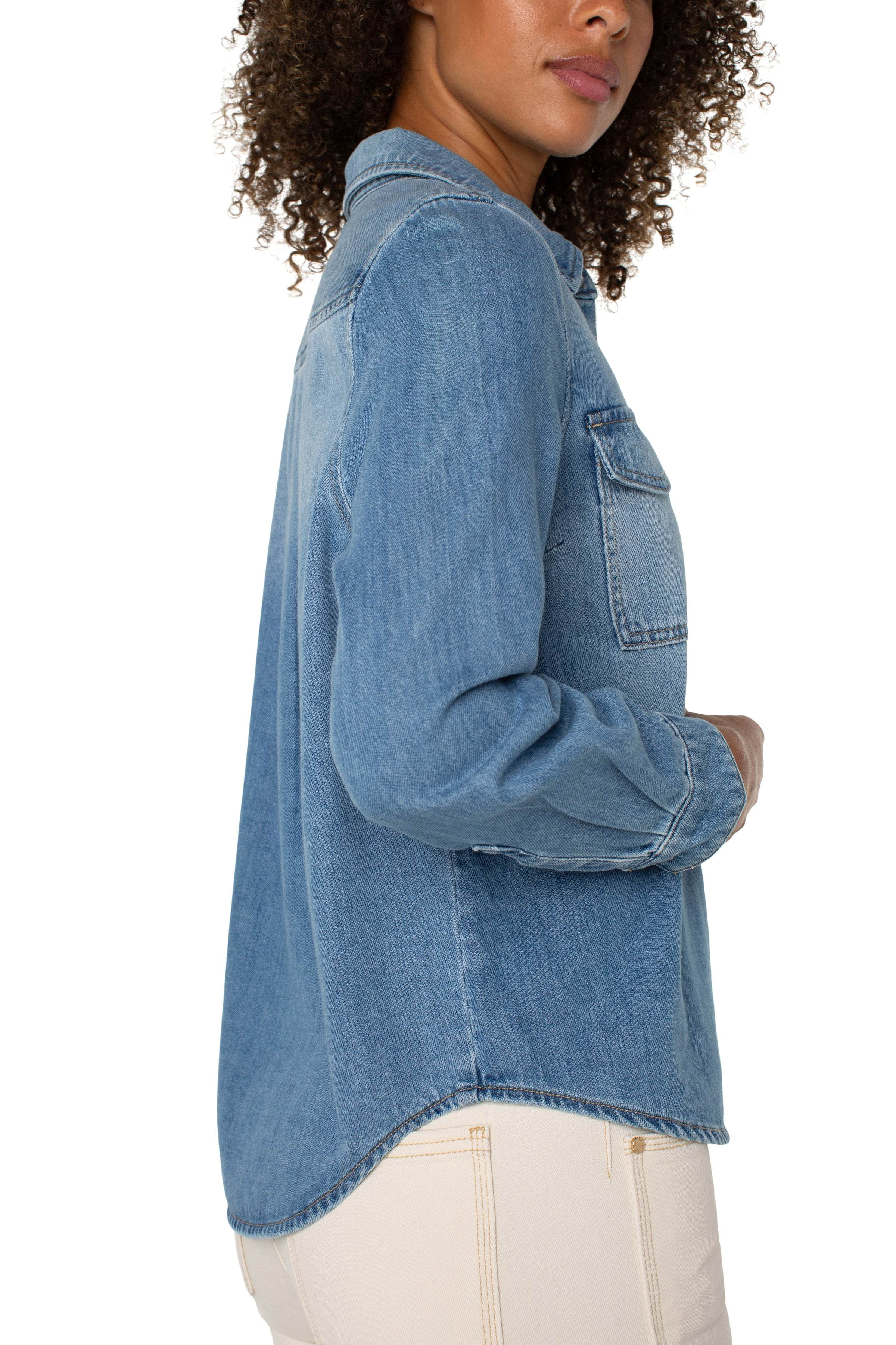 Our denim button-down shirt, accented with pearlescent buttons, is a versatile wardrobe staple that effortlessly transitions from casual to dressy!