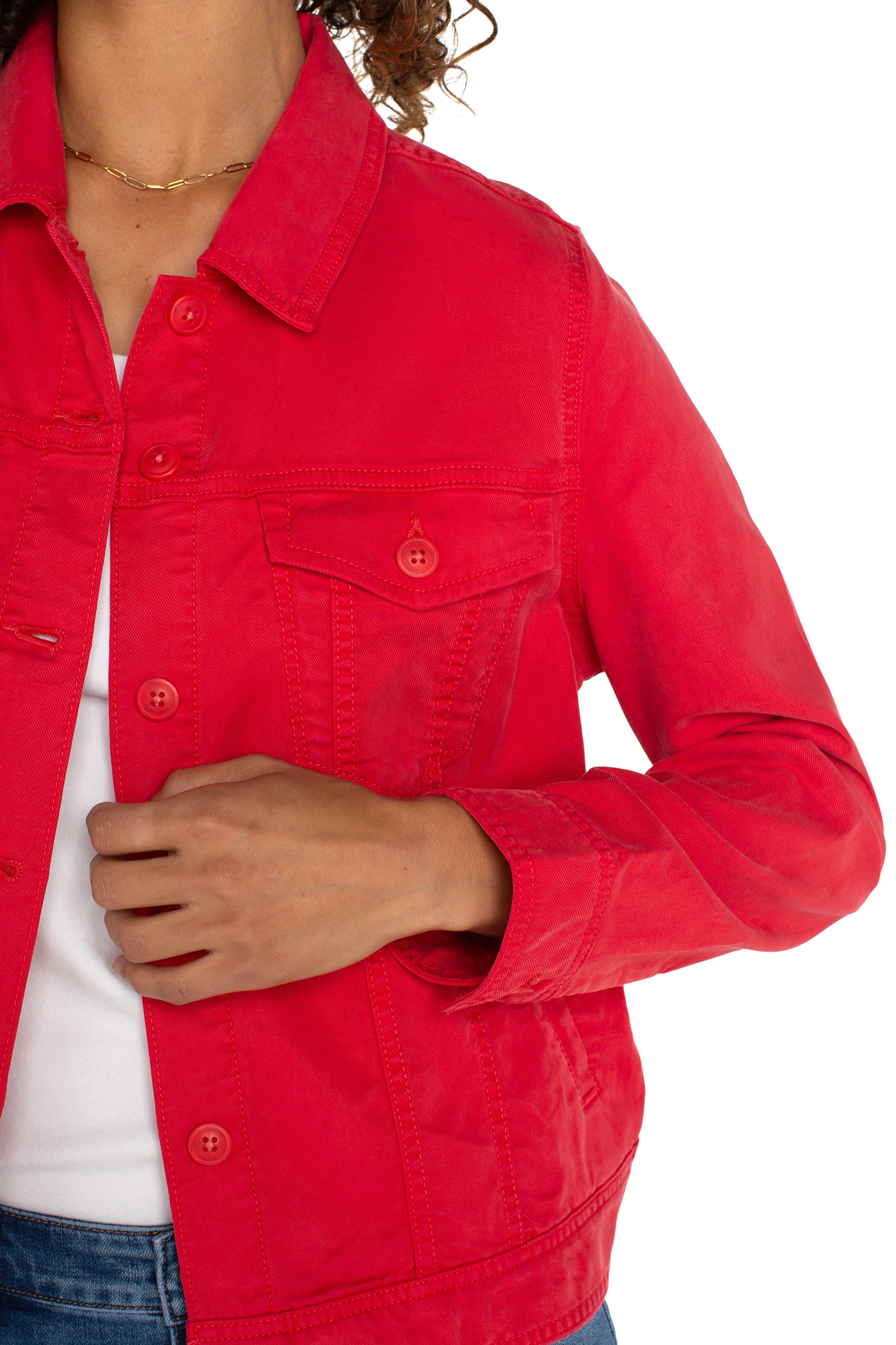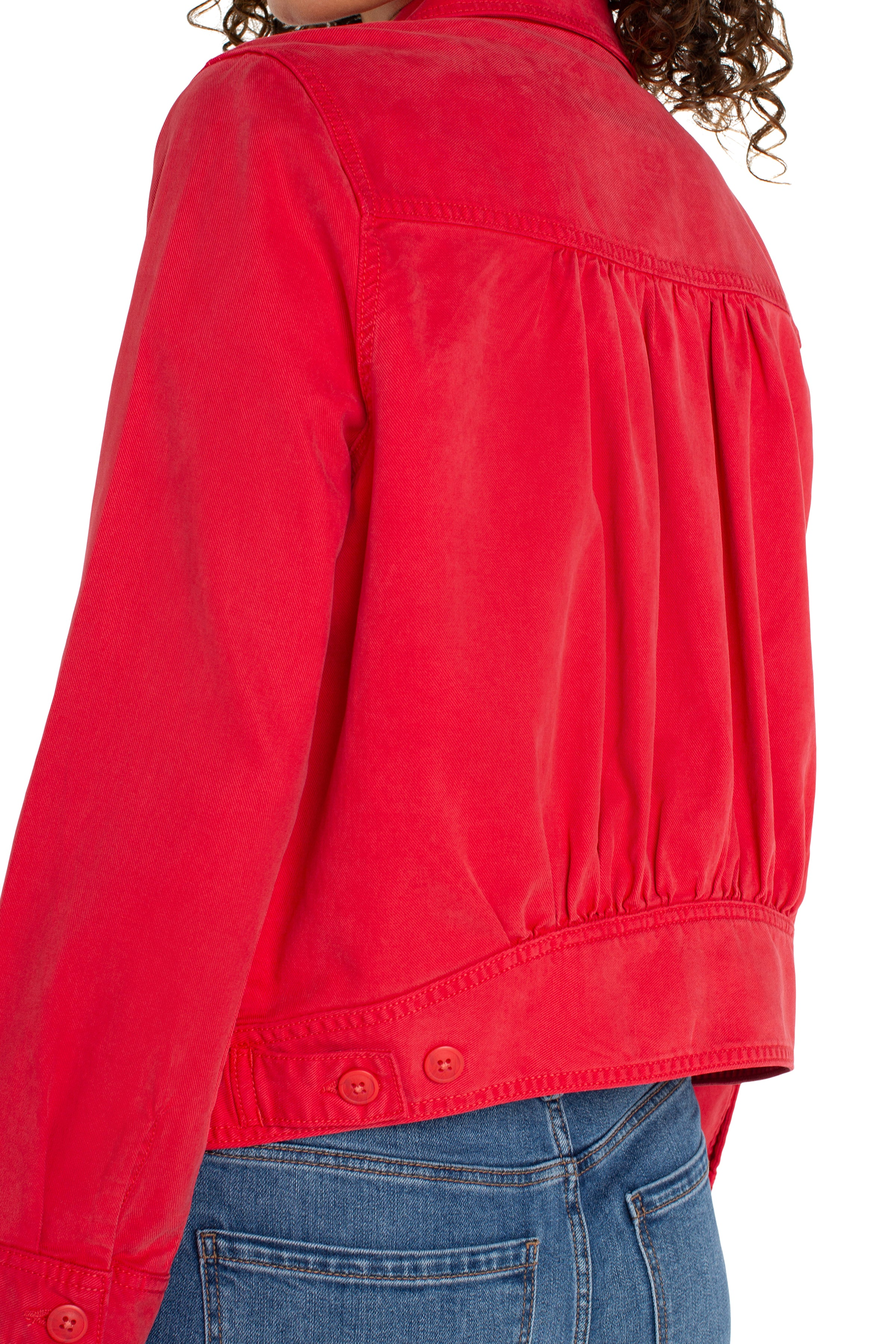 Upgrade your everyday wardrobe with this Peached Twill Trucker Jacket, designed for effortless style and comfort. Made from ultra-soft peached twill, it offers a luxurious feel with a relaxed yet structured fit. The shirring detail at the back enhances the silhouette for a flattering touch. Perfect for layering, this versatile jacket pairs seamlessly with any outfit, making it a must-have staple for any season.