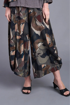 Relaxed, wide leg lantern style pant with elastic waist, two front pockets and hi-low draped detail at the bottom
