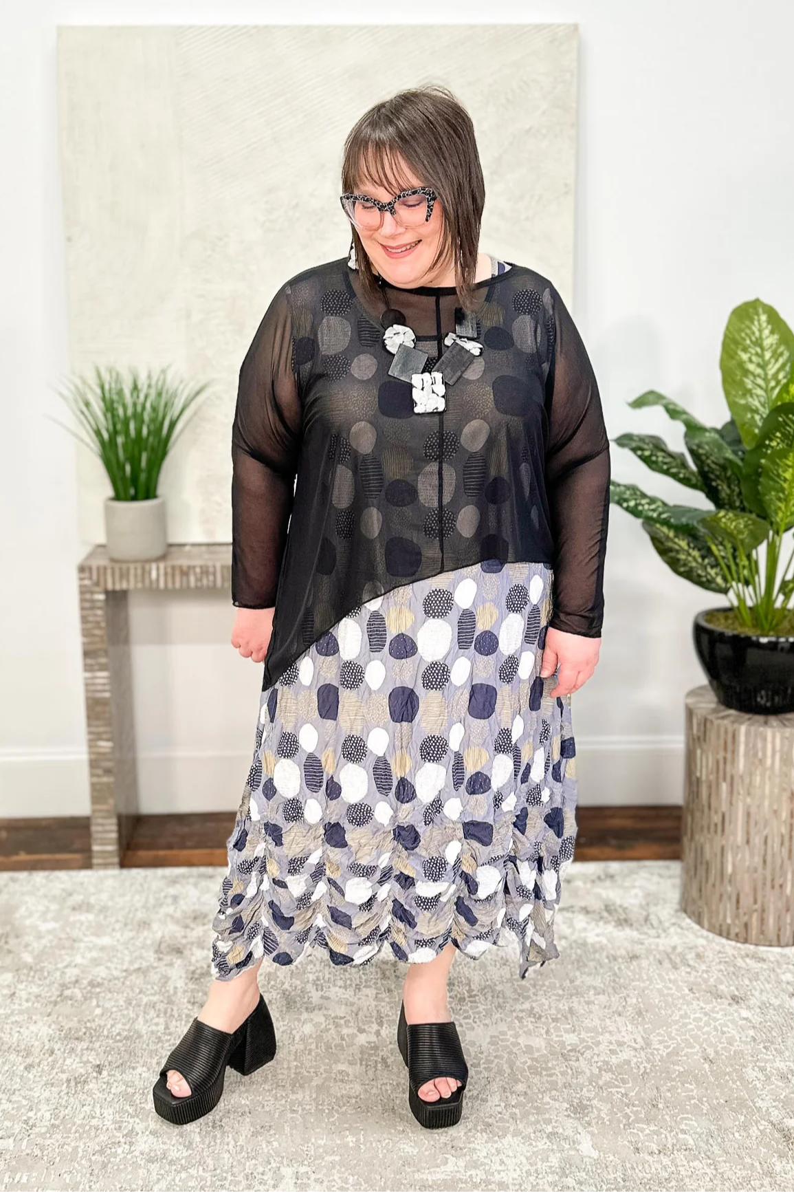 This lightweight knit mesh topper is the ideal layer to elevate both basics and printed outfits. In classic black, it features a striking angled asymmetric hem that adds a modern, eye-catching touch.