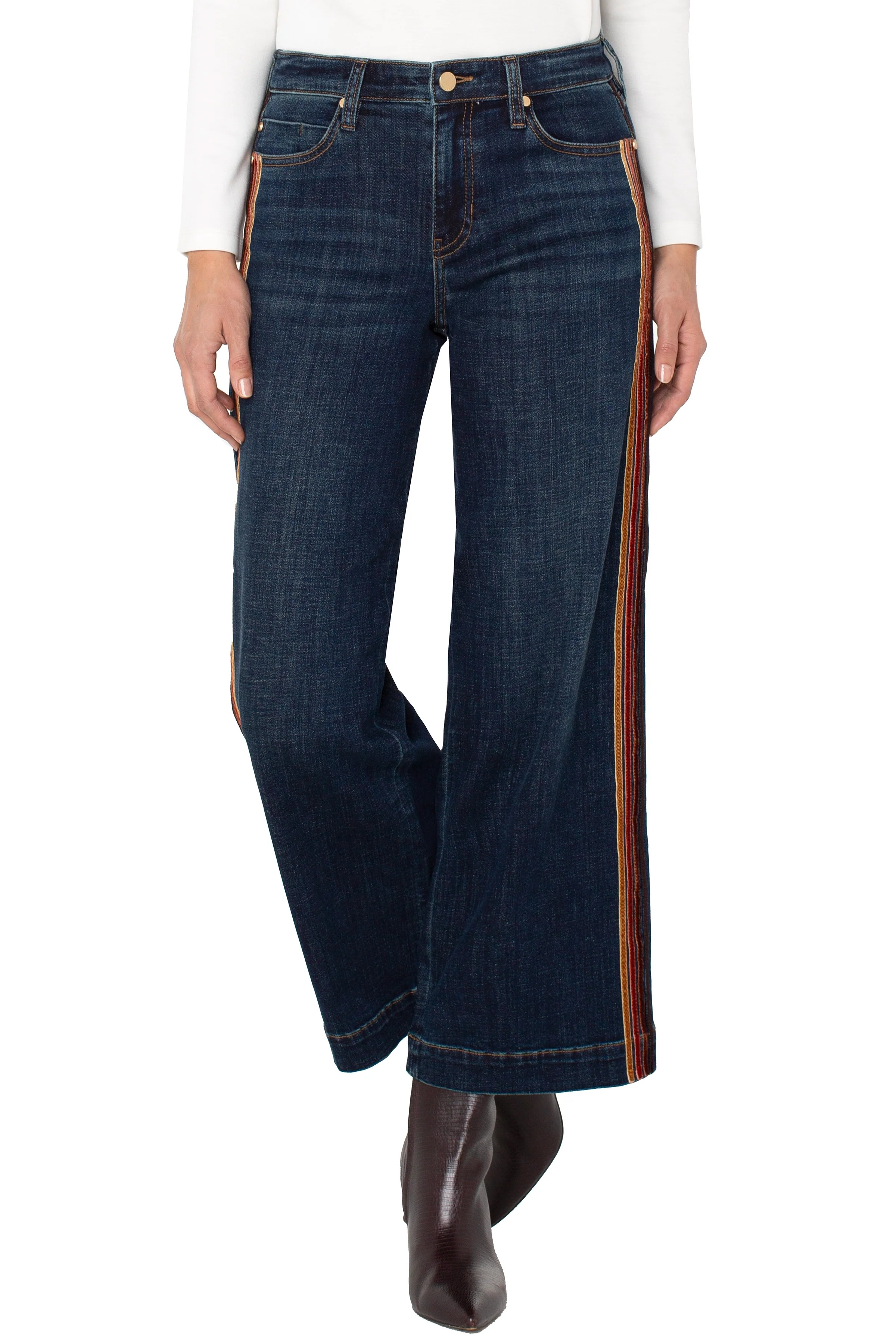 With a vintage feel and a modern twist, this wide-leg silhouette is elevated by rich velvet side trim for an unexpected touch of luxe. Crafted from soft crosshatch denim in Eastmoor, it offers the perfect balance of structure and fluidity. Style it with a sleek knit or tailored blazer—this is denim, redefined.