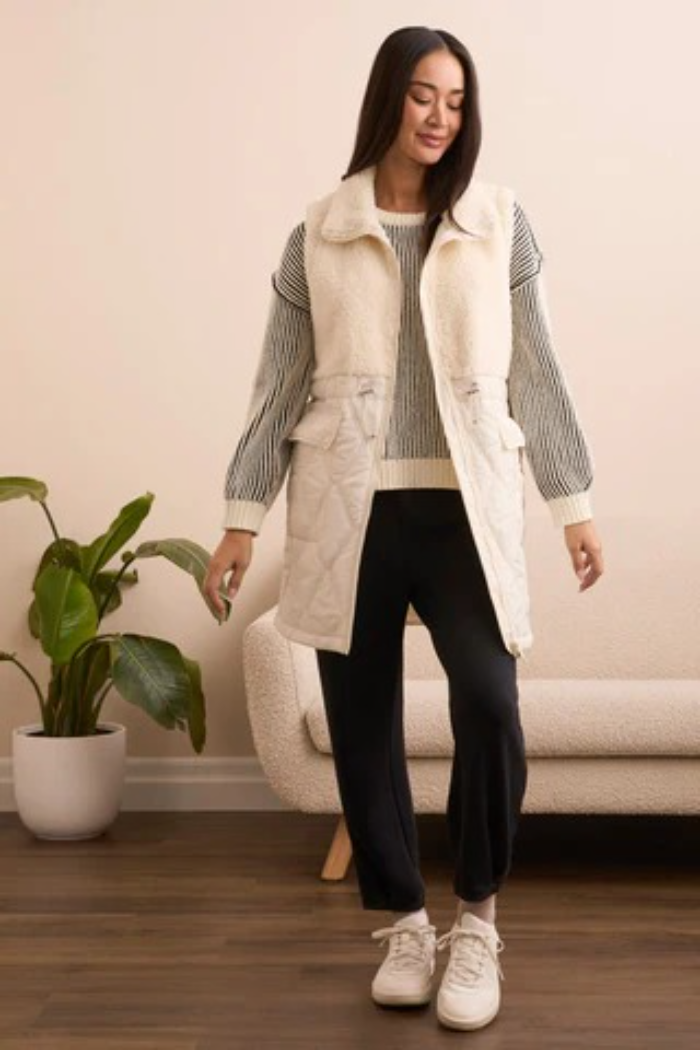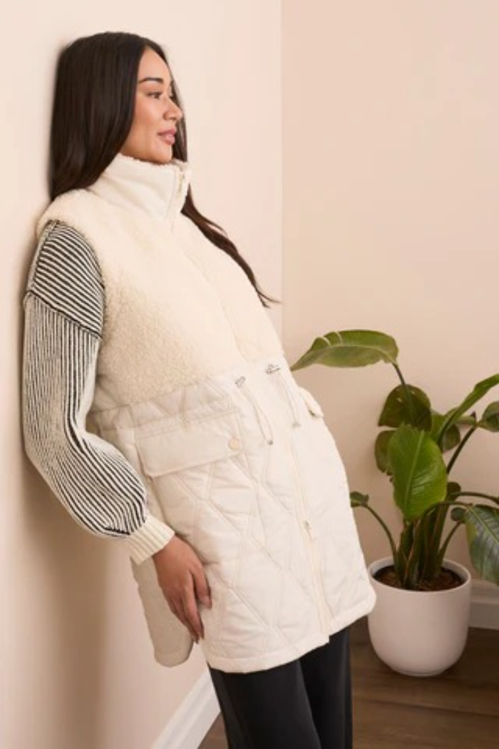 Embrace cool weather with the cozy elegance of this vest, made from a luxe blend of sherpa and quilted fabric for added texture and warmth. The high collar offers extra protection against the chill, while side pockets keep your hands warm or offer a convenient spot for your essentials.