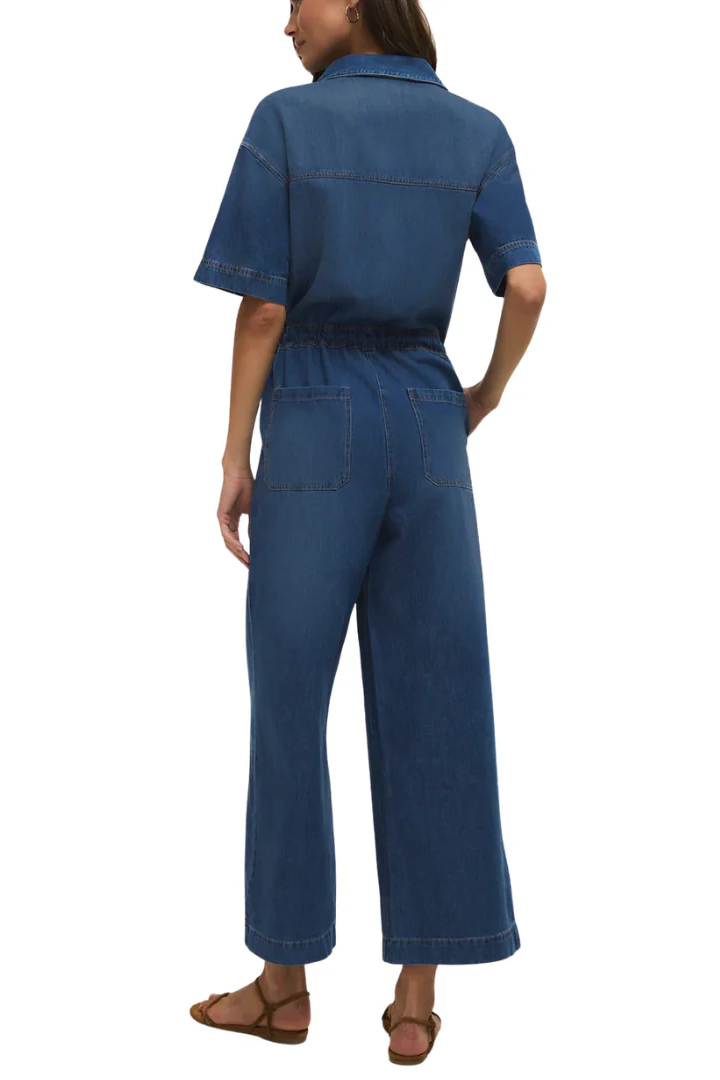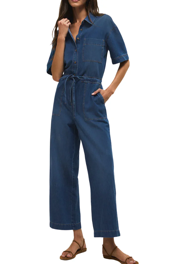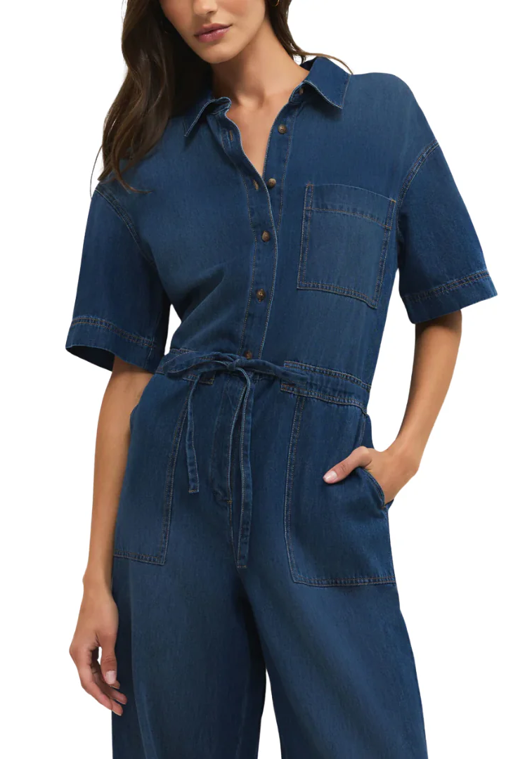 The Z Supply Elise Denim Jumpsuit is a relaxed one‑piece in soft denim with a button‑front, chest patch pocket and a self‑tie waist for adjustable shaping. Z Supply designs this jumpsuit with short sleeves and wide legs for an easy, everyday silhouette. Wear it for casual weekends or throw on a jacket for a more polished look.